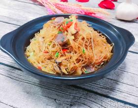 倒粉丝翻炒沿锅边加一点点水,放水辣椒倒老抽翻炒均匀,起锅前撒上葱花