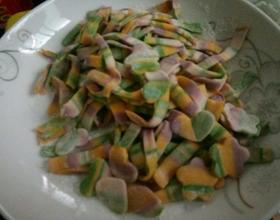 - 1. 南瓜,紫薯,西红柿,菠菜榨汁或泥,和面,用筷子搅成面絮,比例偏硬,揉成面团。