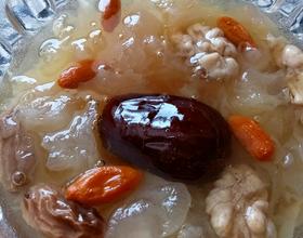 - 3. 煮沸后转小火继续熬 熬到见银耳有胶质出来 有 汤汁有粘稠的时候 倒入 枸杞 香妃葡萄干 核桃仁 冰糖 再继续熬