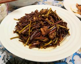 蕨菜切段,洗净备用,肉切丝,蒜切碎