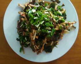 乡村野生折耳根(不要买人工肥料种植的),将折耳根的老根和须掐去,留下嫩白根及叶片,掐成3厘米左右小段,用清水多洗几遍,洗净泥沙,用冷水浸泡10分钟,捞出倒入网盆里沥干水分待用。野葱摘洗干净,用冷水浸泡10分钟,捞出倒入网盆里沥干水分,切成1厘米左右小段。(没野葱可用小葱替代,小葱切碎葱)。