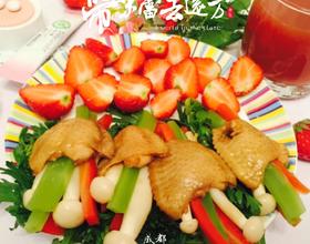 将腌制好的鸡翅取出、插入胡萝卜条、莴笋条、白玉菇