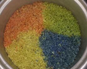 已经上好色的大米按颜色放入电饭锅,糯米的话最好是蒸着煮 可以适量的放少许盐,这样米饭才有味
