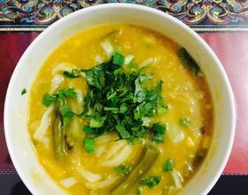 米淇快熬好的时候放盐,炒锅放少许油,放入姜蒜片爆香,这一步很重要,那是当地酸菜,忽略不计,然后放入米淇中,听到呲的一声,香味扑鼻,可以开吃了呵呵