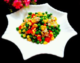 锅里放油烧至五成热。将胡萝卜丁,玉米粒,青豆放入翻炒一分钟左右放盐倒入适量温水大火煮二分钟放入鸡精虾仁翻炒均匀。