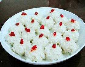 双手端着盘子摇晃(转圈),让肉圆子都裹上糯米。