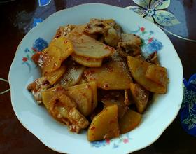 放入煸熟的猪肉片,翻炒。放入适量的白糖和食欲调味。