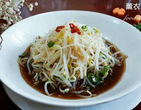 用生抽,味精,辣椒油,香醋调匀浇在豆芽上,花椒油重新烧热至微冒烟浇在葱花上