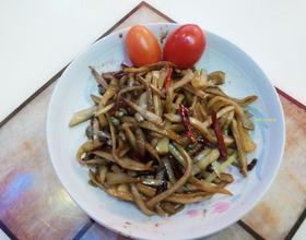 将炒锅烧热,倒入适量食用油,放入一把干辣椒煸香,喜欢吃辣的可以多放点