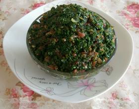 把剁碎的苜蓿挤去水分,和入味的肉糜放一起,再放入适量食用油、盐、芝麻油。