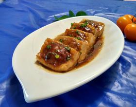 豆腐两面煎好后,把调好的料汁倒入锅中,盖上盖子焖煮1一2分钟收汁至汤汁浓稠就可以出锅装盘撒上葱花即可