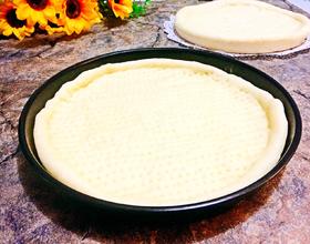 - 11. 把饼皮放进披萨盘里,用手整成中间薄边上厚的样子。