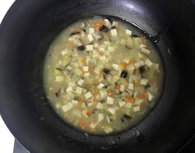 豆腐倒入锅里,接着倒入虾皮煮两分钟