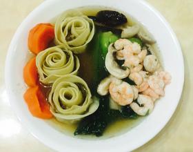 配料捞起摆盘,做了一点点蒜蓉酱油勾芡的酱淋在虾身上,嫌麻烦也可以不做。  - 13. 汤玫瑰饺子