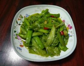 油热加蒜和辣椒,再下芋苗炒,因为生的芋苗水分足,不用加水。