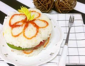 熟米饭用保鲜膜做2个大小相同的汉堡胚。