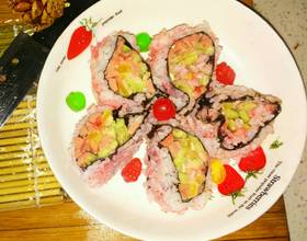 - 6. 切7块 把边缘去掉 留中间五个 摆成花形 调整一下 再薄薄撒一层樱花鱼松粉;O了