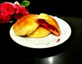 - 6. 把醒好的面团擀成圆皮,中间放入草莓酱