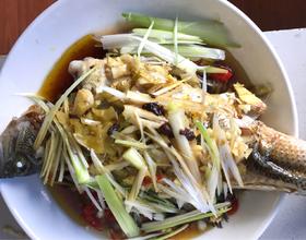 - 7. 把葱丝儿,泡菜,姜蒜,小米椒铺在蒸好的鱼上面。