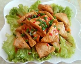 - 8. 煎金黄色后加料酒,茴香,生抽,盐,水,红椒,水烧干剩下三分之一,出锅撒葱,汤淋上