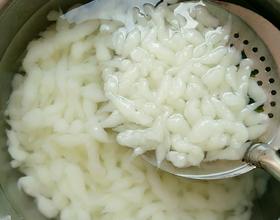面糊倒入水中的时候,加一勺一个方向搅拌烧开在倒另一勺。不停得搅拌,小火烧直冒泡。还有稀稠度,搅拌的时候特别费劲,用勺立在锅中间不易倒就可以,面糊太稀漏不出来凉鱼