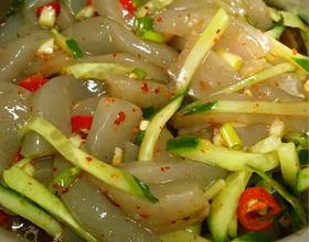 黄瓜切丝、葱切花、蒜拍扁切碎、小米椒切小段