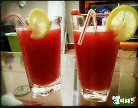 - 6. 把准备好的柠檬挤汁到西瓜汁里面,摇匀。(天气太热可以放到冰箱冰冻一下哦~)