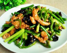 再放入黑木耳,青椒丝,加上生抽、鸡精、盐翻炒至蒜苔略变色