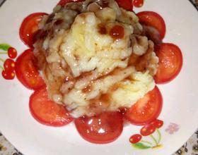 取一勺蜂蜜一勺蓝莓酱放在一块搅拌均匀(这一步粗心的我忘拍了)浇在土豆泥上就完成了