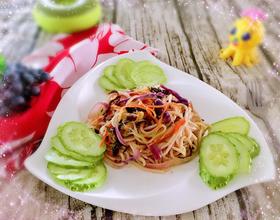 - 8. 倒入黑木耳煸炒,炒熟后,倒入各种丝除紫甘蓝丝,再倒入米线,加盐,蚝油调味,起锅前倒入紫甘蓝丝,装盘。再切几片黄瓜片装饰一下。