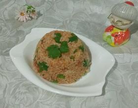 翻炒至每一粒米都均匀沾满番茄酱。关火。