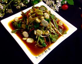 青笋胡萝卜切细丝,蒜、小米辣剁碎。