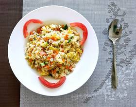- 8. 再加入黄瓜粒和鸡蛋翻炒均匀。