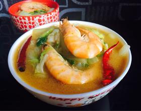 中火炖五六分钟后,加入红干椒和虾,再炖一分钟关火。