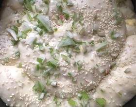 - 4. 电饭锅预热几分钟刷上油断电撒上芝麻,葱花(忘了拍照)
