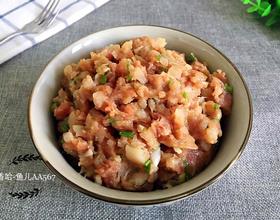 牛肉用绞肉机绞碎,和葱末、调料一起放进盆里搅拌均匀。