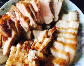 锅里放适量的食用油,小火烧至七成热,把上色后的猪肉放锅里均匀炸成金黄色,捞出沥干油备用。(猪皮一定要炸好,油温不能太高,以免烧焦)