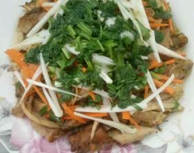 把葱丝胡萝卜丝香菜放在鸡腿肉上