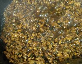 炒至姜蒜粒金黄倒入肉丁添加料酒 花椒油 不放盐生抽(多一点) 老抽 少许糖 喜欢吃辣的可以放红辣椒粉 肉丁缩小出油倒香菇下锅 翻炒 水炒干有油色 小火慢炒即可