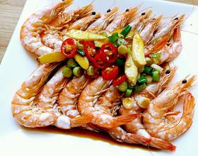 把冻虾自然解冻,冲洗干净,拌一点料酒姜丝泡五分钟,挑出虾控干,隔水蒸五分钟,趁热装盘摆摆造型