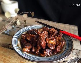 加入2勺生抽、2勺老抽、1勺花雕酒、2块冰糖、半勺蚝油和1滴醋,继续炒至几分钟让肉块上色;