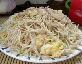 下少许油将面条炒上,倒上备好的肉丝.鸡蛋.洋葱.芽菜放入锅里,把调好的汤汁与面条拌匀反复翻炒至出锅