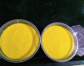 准备干净的模具,把打好的芒果泥倒在模具上,然后抖几下把气泡抖出来。