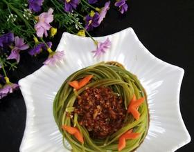用胡萝卜做几只小鸟 将汁浇在盘好的蒜苔上面就完成了。