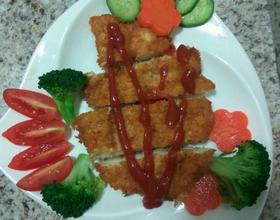 - 8. 盘子中摆放点凉拌的西兰花及胡萝卜和黄瓜点缀下,把炸好一块鸡排,切成三块,上面挤入番茄酱,炸鸡排搭配蔬菜,好吃不油腻。