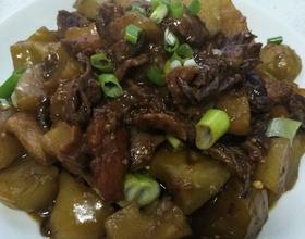 汤汁烧开以后放入准备好的土豆和茄子干一同用中火炖制25分钟