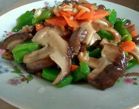 放入香菇片翻炒,然后放青椒块继续翻炒,加盐耗油,水淀粉勾簿芡。