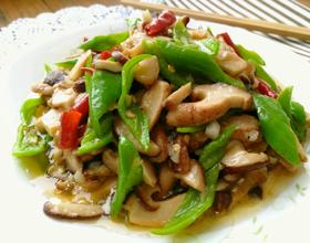 放入香菇翻炒出菜汁后加入青椒再炒片刻调味即可。