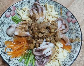 胡萝卜,芦笋,腐竹,切丝,小章鱼对半切开,过水焯熟。