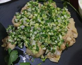 - 3. 烧一锅水,加适量姜片,香葱段烧开(可用腌制材料),将腌制好的鸡腿浸入三次后放入,煮15分钟。捞出后浸入冰水,三分钟后取出切块摆盘。将色拉油烧辣,淋入姜葱沫拌匀,然后将料铺在鸡块上,大功告成!